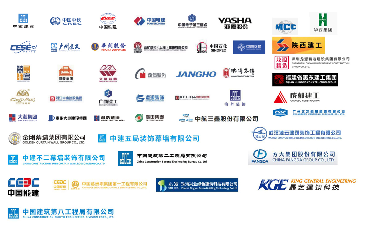 公司參建了諸多大型項目工程,如港珠澳大橋、珠海國際航展、深圳國際會展中心、廣州白云機場、西安全運會場館、成都東安湖大運會場館、樂山奧體中心、洛陽奧體中心、增城富士康廠房、惠州中海油、陽江核電站、珠三角各地鐵線、高鐵站、廣西桂林機場、廣西柳州文化廣場、四川成都天府機場、海南??诿捞m機場、西安絲路會展中心、惠州北站等等。與中國建筑、中國中鐵、中國鐵建、中國電建、中國交建、中國中冶、中國能建、廣東建筑、廣西建工、廣州建筑等大型國有企業下屬公司及江河幕墻、金螳螂裝飾等各大建筑裝飾、幕墻裝飾公司達成長期友好合作關系。